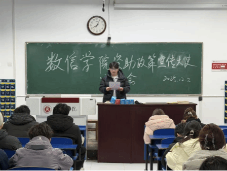 为全面落实国家及学校大学生资助政策,充分发挥榜样示范引领作用,营造“励志成才、感恩奋进”的校园氛围,12月2日,tyc5997太阳集团官网开展资助政策宣传大使宣讲会。2024-2025学年国家奖学金获得者数学221班黄文聪担任宣讲大使,全体大一新生参与此次活动。